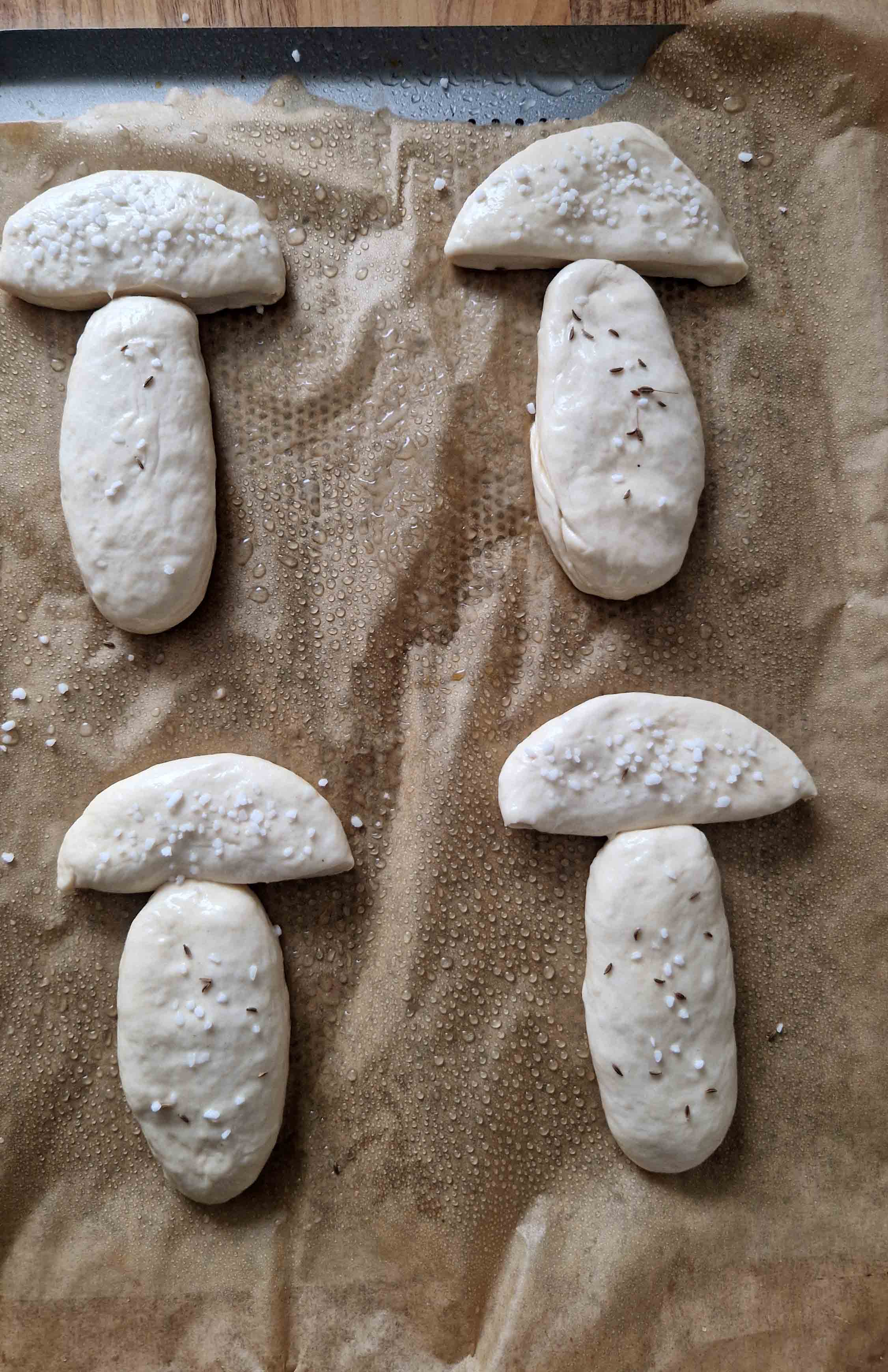 Jede Salzstangerl-Teig-Portion rundschleifen, mit Wasser besprühen und noch einmal ca. 20 min zugedeckt rasten lassen.